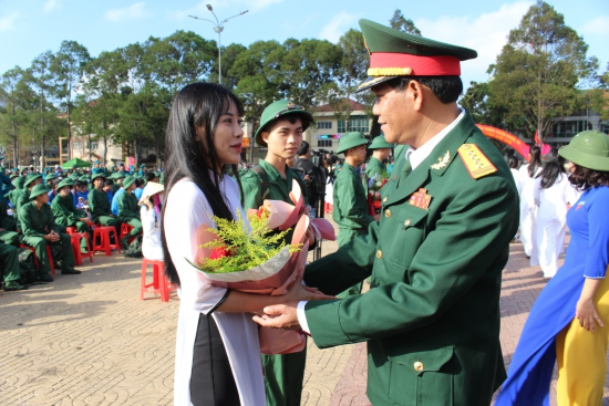 Đại tá Niê Ta, Chỉ huy trưởng Bộ Chỉ huy Quân sự tỉnh Đắk Lắk tặng hoa chúc mừng nữ tân binh ưu tú của TP. Buôn Ma Thuột.