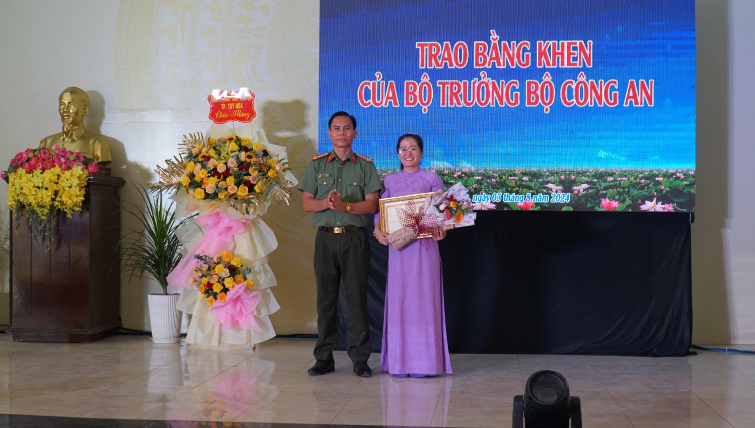 Đồng chí Đại tá Nguyễn Khoẻ - Phó Giám đốc Công an tỉnh thừa uỷ quyền Bộ Công an trao bằng khen cho Hội LHPN phường Phú Lâm