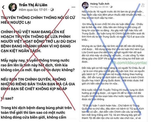Ví dụ như việc, các đối tượng đã tung tin sai lệch việc bệnh nhân thứ 17 nhiễm dịch bệnh COVID-19 Nguyễn Hồng Nhung tham dự khai trương hãng thời trang Uniqlo tại phố Phạm Ngọc Thạch, TP Hà Nội (nhưng thực chất bệnh nhân đã được cách ly từ ngày hôm trước); xuyên tạc chính quyền đã chuẩn bị lò hỏa thiêu cho các địa phương; các tuyến phố ở Thành phố Hồ Chí Minh bị cách ly, cô lập hoàn toàn; hình ảnh chụp lại màn hình từ của một tài khoản Facebook được cho là của cô gái nhiễm bệnh với dòng trạng thái: “Bệnh tình rất yếu, suy kiệt sức khỏe và xin lỗi người dân cả nước”…