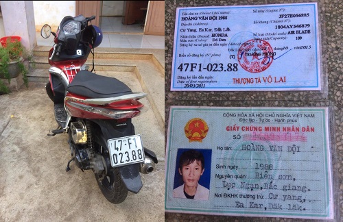 Hai đối tượng gồm: Hoàng Minh Hùng (sinh ngày 05/3/1993; CMND số: 241.368.201; HKTT: thôn 5, xã Ea Pal, huyện Ea Kar, tỉnh Đắk Lắk) và Nguyễn Văn Hưng (sinh ngày 25/5/1991; CMND số: 241.319.447; HKTT: thôn 5, xã Cư Ni, huyện Ea Kar, tỉnh Đắk Lắk). Đối tượng Hoàng Minh Hùng khai nhận mua chiếc xe mô tô trên của 01 người (chưa xác minh được nhân thân) thông qua mạng xã hội với giá 24.000.000đ (hai mươi bốn triệu đồng), người bán giao xe kèm theo 01 CMND không rõ số mang tên Hoàng Văn Đội. Sau khi mua chiếc xe trên, Hoàng Minh Hùng liên hệ với Nguyễn Văn Hưng bàn kế hoạch mang chiếc xe trên lên TP. Buôn Ma Thuột cầm cố lấy tiền tiêu xài. Để tránh bị phát hiện, 02 đối tượng đã bóc gỡ ảnh trên CMND mang tên Hoàng Văn Đội và lấy ảnh của Nguyễn Văn Hưng dán vào và ép plastic, sử dụng để cầm cố tài sản tại cơ sở cầm đồ địa chỉ trên.