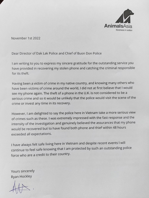 Ngày 01/11/2022, ông Hockley Ryan Jonathan (sinh năm 1969), quốc tịch Anh, là chuyên gia của tổ chức Động vật châu Á (Animals Asia), chuyên nghiên cứu bảo tồn voi, hiện đang tạm trú tại Vườn Quốc gia Yok Đôn, đã gửi thư cảm ơn Công an tỉnh Đắk Lắk và Công an huyện Buôn Đôn đã nhanh chóng điều tra, làm rõ, bắt đối tượng trộm cắp, trao trả tài sản cho ông.