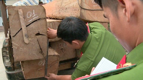 Công an đang tiến hành kiểm điếm số gỗ tang vật