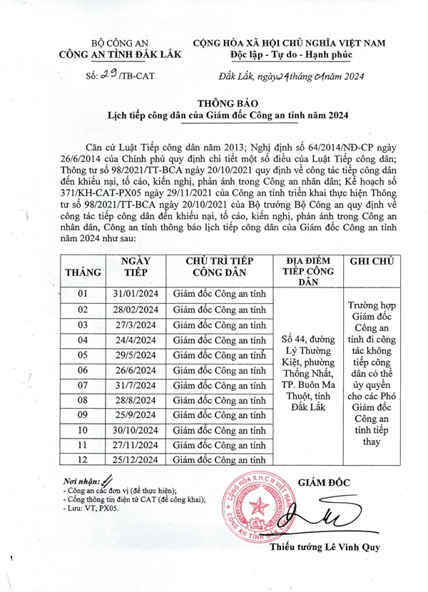 Ngày 06/9/2024 Giám đốc Công an tỉnh ký Quyết định số 2282/QĐ-CAT ban hành Nội quy Địa điểm tiếp công dân của Công an tỉnh, trong đó thể hiện nội dung sau:
