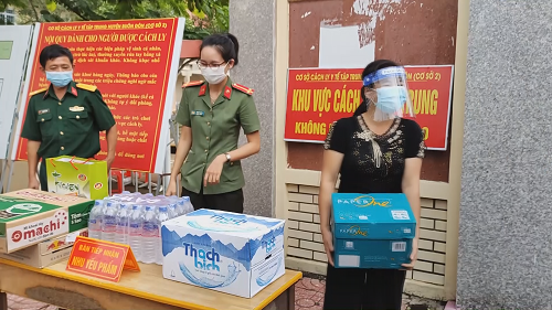 Trung úy Trần Thị Thu (đứng giữa) đi thăm, tặng quà CBCS làm nhiệm vụ tại trung tâm cách ly phòng, chống dịch trên địa bàn huyện