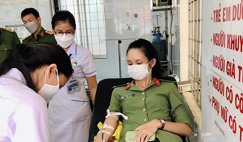 Trung úy Trần Thị Thu tham gia hiến máu nhân đạo giúp hai cháu bé cần tiếp máu gấp.