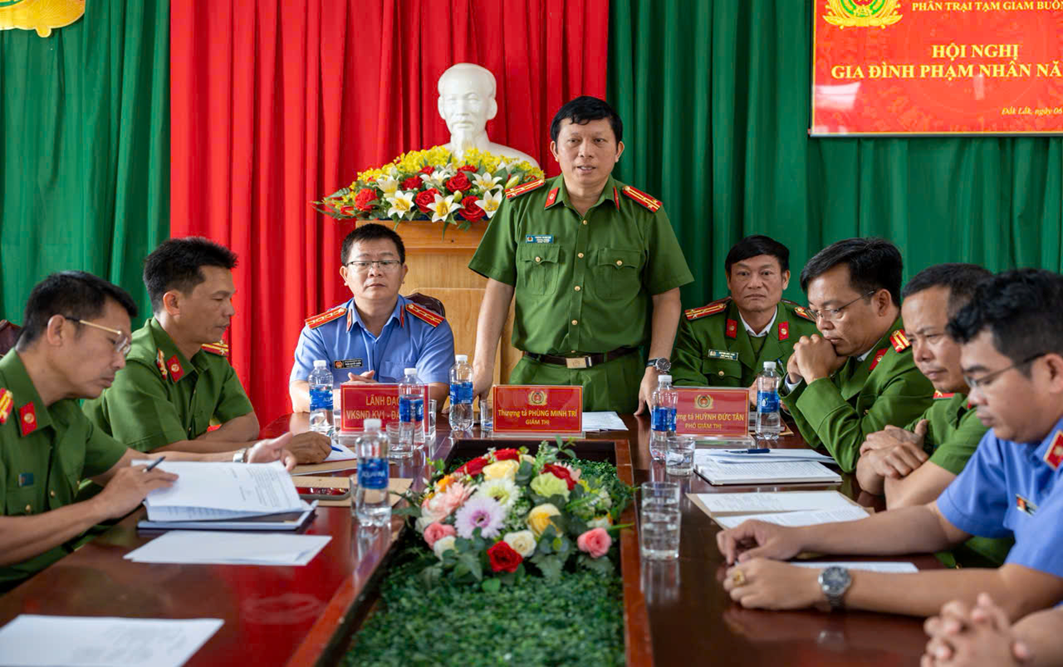Đồng chí Thượng tá Phùng Minh Trí - Giám thị Trại tạm giam số 1, chủ trì Hội nghị. Tham dự Hội nghị có đồng chí Thượng tá Huỳnh Đức Tân - Phó Giám thị Trại tạm giam số 1, đồng chí Trần Quyết Chiến - Phó Viện trưởng Viện Kiểm sát nhân dân khu vực 1, tỉnh Đắk Lắk cùng chỉ huy, cám bộ, chiến sĩ Phân trại tạm giam Buôn Ma Thuột; các phạm nhân và thân nhân các pham nhân đang thi hành án tại phân trại.
