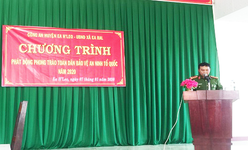 Chiều ngày 07/01/2020, tại Nhà văn hoá xã Ea Ral, Công an huyện Ea H’leo phối hợp chính quyền xã Ea Ral tổ chức phát động phong trào toàn dân bảo vệ an ninh Tổ quốc. Tham gia buổi phát động có trên 200 lượt người, gồm cán bộ thôn trưởng, thôn phó các thôn buôn, hội viên Hội phụ nữ, Đoàn Thanh niên và nhân dân xã Ea Ral.