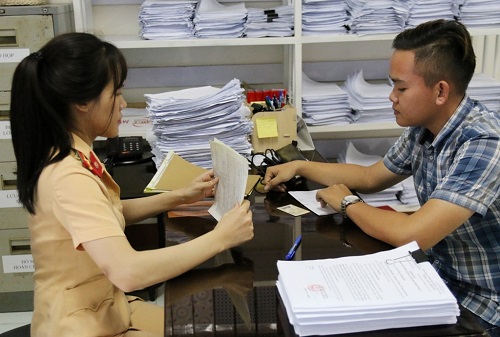 Cán bộ Phòng Cảnh sát giao thông tiếp nhận hồ sơ đăng ký xe của người dân