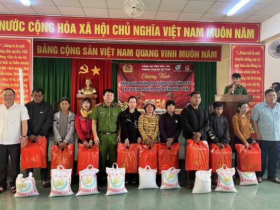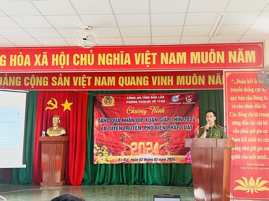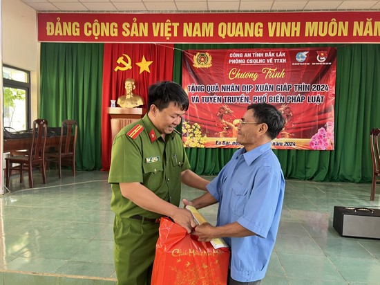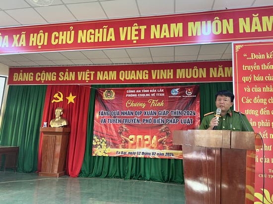 Hòa chung với không khí mừng Đảng, mừng Xuân và đón Tết Giáp Thìn năm 2024, sáng ngày 03/02/2024, Đảng ủy, Lãnh đạo Phòng Cảnh sát Quản lý hành chính về trật tự xã hội - Công an tỉnh ĐắkLắk đã tổ chức chương trình tặng quà nhân dịp Xuân Giáp Thìn và tuyên truyền, phổ biến giáo dục pháp luật tại xã Ea Bar, huyện Buôn Đôn. Tham dự chương trình có các đồng chí đại diện Đảng ủy, chính quyền xã Ea Bar, Công an huyện Buôn Đôn, Công an xã Ea Bar và bà con Nhân dân trên địa bàn.