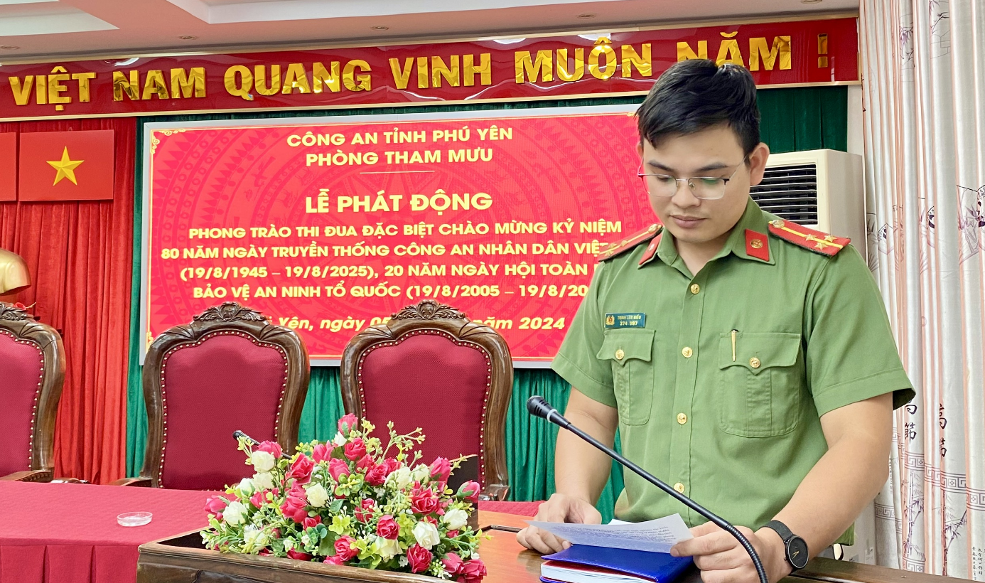 Thực hiện chỉ đạo và hưởng ứng phát động của Lãnh đạo Công an tỉnh, chiều ngày 05/9/2024, Phòng Tham mưu Công an tỉnh Phú Yên tổ chức Lễ phát động phong trào thi đua đặc biệt chào mừng kỷ niệm 80 năm Ngày truyền thống Công an nhân dân Việt Nam (19/8/1945 - 19/8/2025), 20 năm Ngày hội Toàn dân bảo vệ an ninh Tổ quốc (19/8/2005 - 19/8/2025).