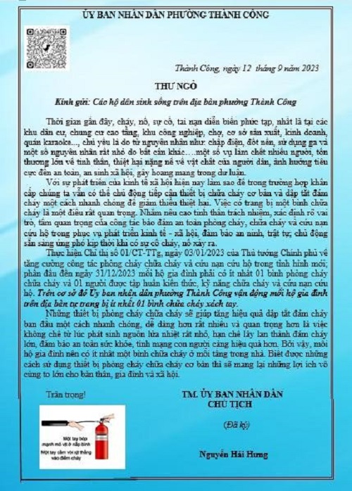 Trên thư ngỏ có kèm mã Qr để người dân quét mã xem tài liệu hướng dẫn tuyên tryền về công tác PCCC