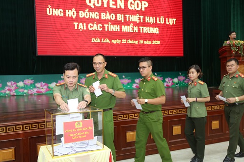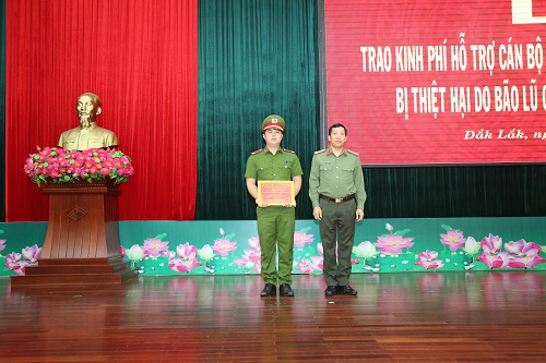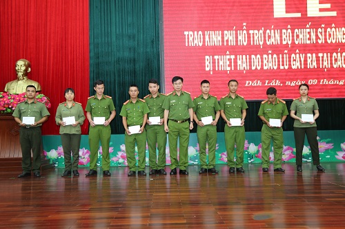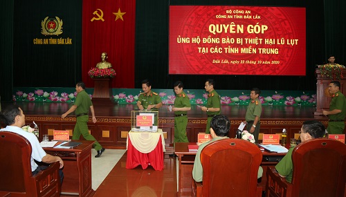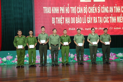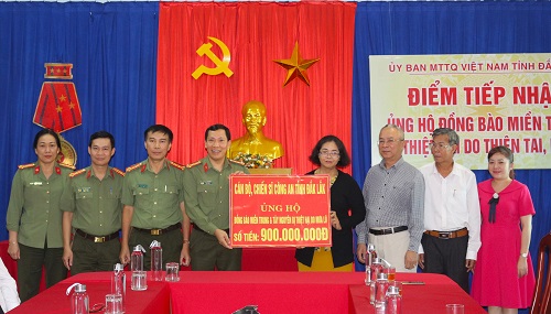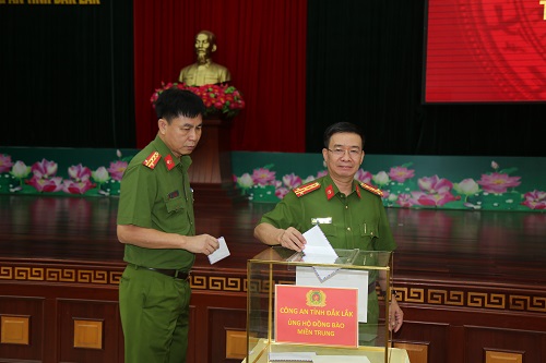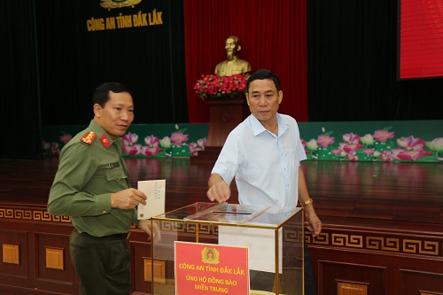 Trong đợt này, riêng Công an tỉnh Đắk Lắk đã phát động mỗi cán bộ, chiến sĩ đóng góp 01 ngày lương và đã chuyển 900 triệu đồng cho Mặt trận Tổ quốc Việt Nam tỉnh để góp phần hỗ trợ, chia sẻ với những hy sinh, mất mát của đồng bào, cán bộ, chiến sĩ các tỉnh miền Trung. Đối với hơn 80 cán bộ, chiến sĩ đang công tác tại Công an tỉnh Đắk Lắk có thân nhân, gia đình ở các tỉnh miền Trung bị mất mát, thiệt hại nặng, Công an tỉnh đã hỗ trợ, chia sẻ gần 500 triệu đồng. Trong đó, đã hỗ trợ cho gia đình đồng chí Nguyễn Hữu Nghĩa, chiến sỹ nghĩa vụ của Tiểu đoàn Cảnh sát cơ động - Công an tỉnh Đắk Lắk 100 triệu đồng. Gia đình đồng chí Nghĩa quê ở Quảng Nam, có bố và anh trai bị mất do bão lũ vừa qua. Hội Phụ nữ – Công an tỉnh cũng đã vận động các nhà hảo tâm đóng góp hỗ trợ thêm cho gia đình đồng chí Nghĩa 100 triệu đồng. Trước đó, Đoàn Thanh niên - Công an tỉnh Đắk Lắk cũng đã vận động một số tổ chức, cá nhân và Đoàn viên thanh niên trong Công an tỉnh đóng góp được hơn 70 triệu đồng đến Quảng Nam thăm, viếng, hỗ trợ và chia sẽ với gia đình đồng chí Nghĩa.