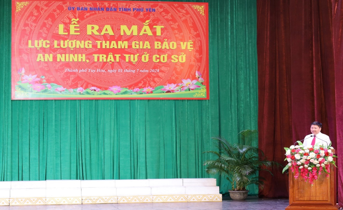 Trình bày diễn văn tại Lễ ra mắt, đồng chí Cao Đình Huy – Tỉnh ủy viên, Chủ tịch UBND thành phố Tuy Hòa biểu dương những cống hiến của Lực lượng Bảo vệ dân phố, Dân phòng, Công an xã bán chuyên trách trong thời gian qua. Từ ngày 01/7/2024, Luật Lực lượng Tham gia bảo vệ ANTT ở cơ sở có hiệu lực thi hành. Đây cũng là ngày đánh dấu sự ra đời của một lực lượng mới: Lực lượng Tham gia bảo vệ ANTT ở cơ sở.Đồng chí Cao Đình Huy - Chủ tịch UBND thành phố Tuy Hòa phát biểu tại Lễ ra mắt