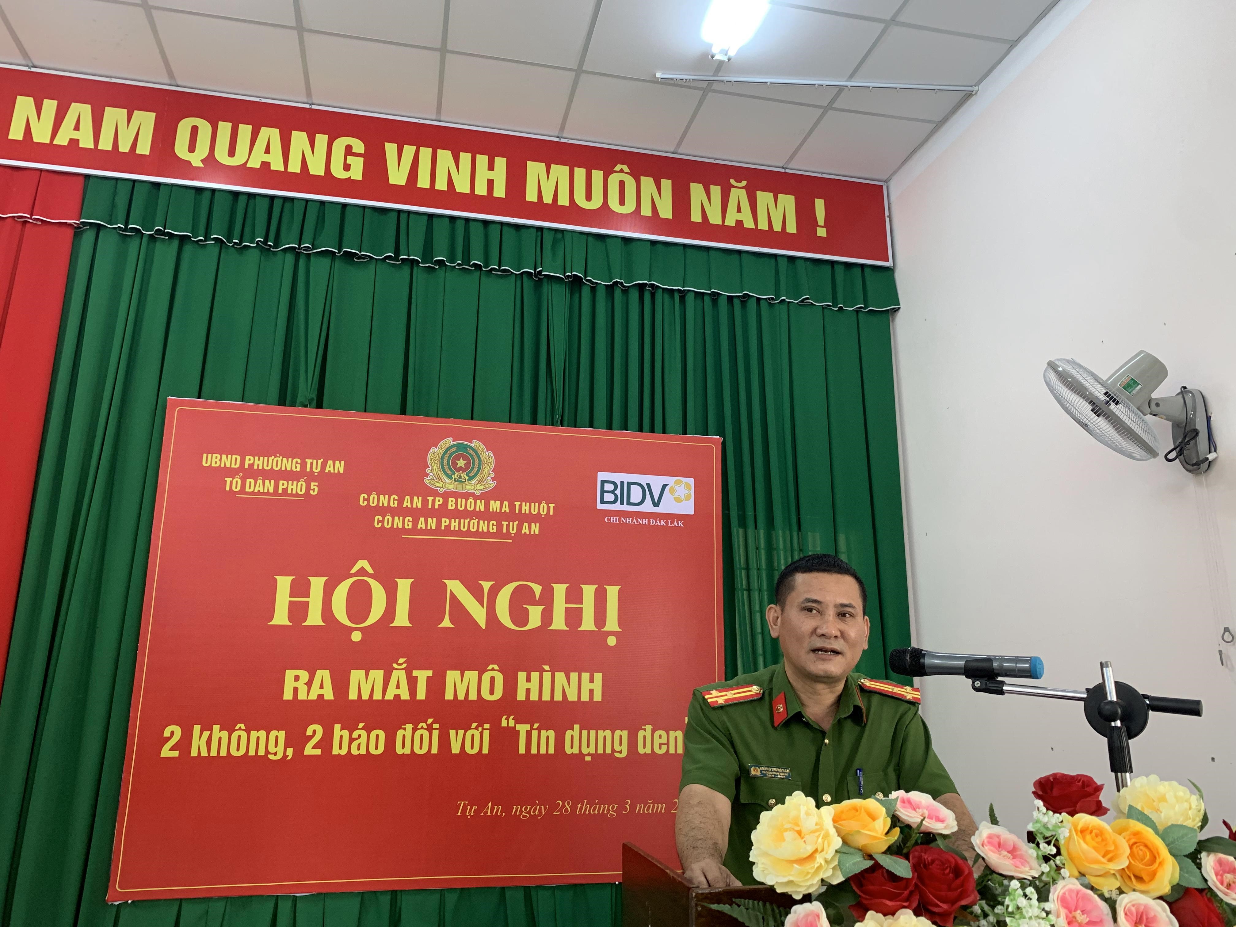 Tại hội nghị, đồng chí Thượng tá Hoàng Trung Nam – Phó trưởng Công an thành phố Buôn Ma Thuột phát biểu: "Việc triển khai Mô hình "2 không 2 báo đối với "tín dụng đen" trên địa bàn phường Tự An được kỳ vọng sẽ mang lại hiệu quả cao trong công tác tuyên truyền, nâng cao nhận thức cho người dân cũng như hỗ trợ kịp thời đối với người dân trong việc nhận diện, phòng ngừa với tội phạm "tín dụng đen". Đề nghị Công an phường cần tranh thủ sự quan tâm, ủng hộ của cấp ủy Đảng, Chính quyền địa phương cùng tham gia, phối hợp, hỗ trợ xây dựng thành công và nhân rộng trên phạm vi toàn phường. Cần có sơ kết, tổng kết đánh giá và đề ra những cách làm hay, hiệu quả, phối hợp chặt chẽ với chính quyền địa phương và các đội nghiệp vụ Công an thành phố đẩy mạnh công tác tuyên truyền, tăng cường vận động Nhân dân tích cực tham gia phong trào toàn dân bảo vệ an ninh Tổ quốc, phòng ngừa, đấu tranh có hiệu quả với các loại tội phạm nói chung và tội phạm liên quan "tín dụng đen" nói riêng, góp phần kéo giảm bền vững các loại tội phạm, tệ nạn xã hội, giữ gìn an ninh trật tự ngay tại địa bàn cơ sở, từng bước xây dựng xã hội trật tự, kỷ cương, an toàn và văn minh”.