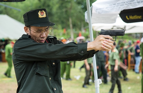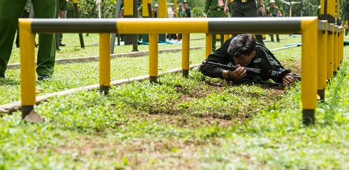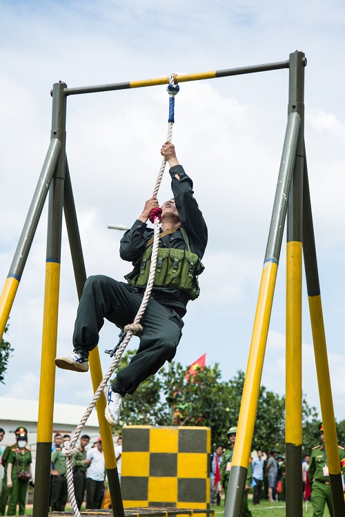 Phần thi quân sự gồm 2 nội dung Vượt vật cản và Bắn súng quân dụng. Trong đó, phần thi Vượt vật cản có 2 đồng chí tham gia, mỗi đồng chí vượt 11 cản vật, cự ly 200m. Còn phần thi Bắn súng quân dụng gồm 9 nội dung: Bắn chậm súng ngắn CZ75; Bắn điểm xạ súng Tiểu liên AK, phối hợp súng ngắn CZ75; Bắn điểm xạ súng Tiểu liên AK; Bắn súng trường bắn tỉa 2 mục tiêu; Bắn vận động ba tư thế súng ngắn CZ75; Bắn vận động hai tư thế súng ngắn CZ75; Bắn ứng dụng súng ngắn CZ75; Bắn đĩa súng ngắn CZ75.