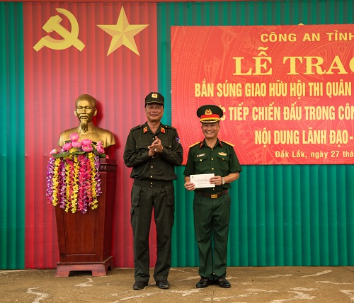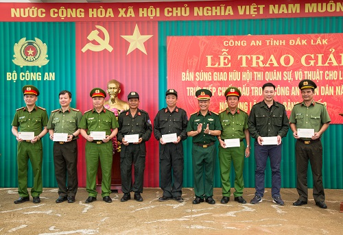 Các đồng chí lãnh đạo Công an tỉnh Đắk Lắk tham gia phần thi bắn súng