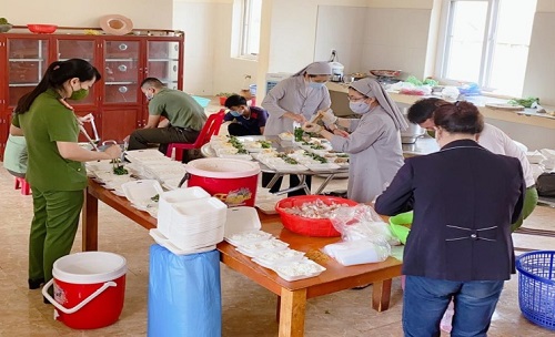 Giáo xứ Ea H’leo cùng với Công an huyện nấu các suất cơm từ thiện hỗ trợ bà con trong đợt dịch Covid-19