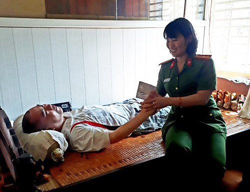 Thiếu tá Mai Thị Hoài Thanh thăm hỏi động viên người dân ở Tổ dân phố 3, phường Tân Thành, gia đình có hoàn cảnh khó khăn bệnh tật