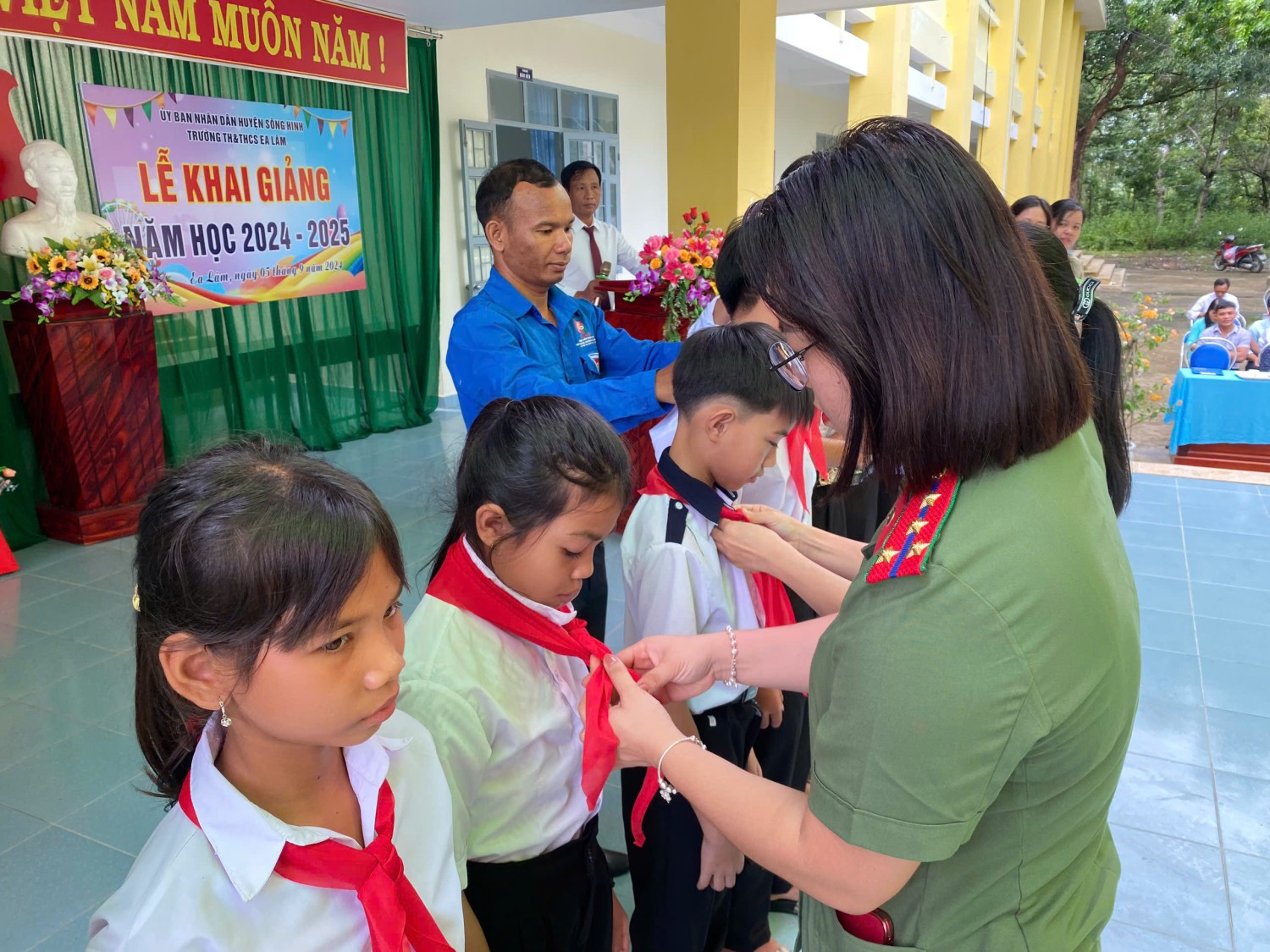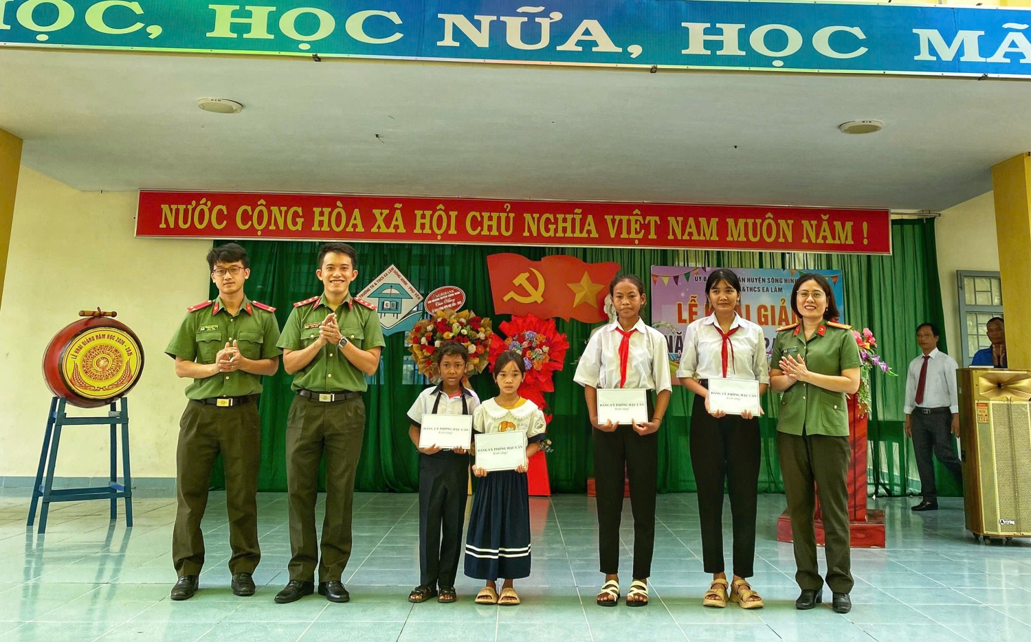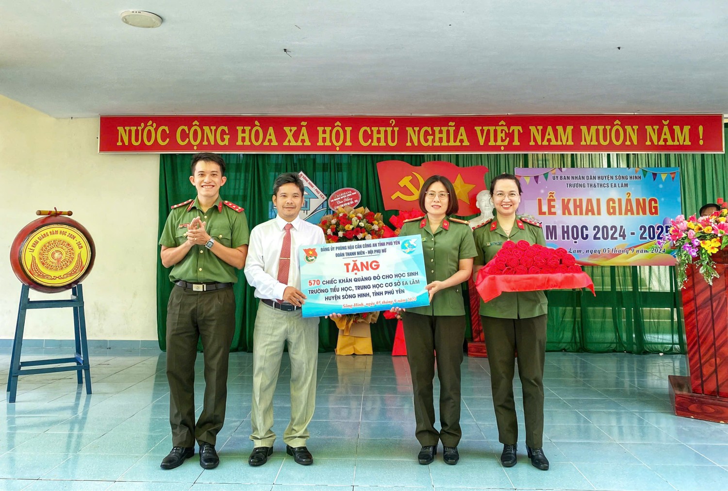 Được sự đồng ý của Đảng uỷ Phòng Hậu cần, ngày 05/9/2024, Đoàn cơ sở, Hội phụ nữ cơ sở phối hợp tổ chức Chương trình "Tặng khăn quàng - Nối ước mơ” cho các em học sinh Trường tiểu học, trung học cơ sở Ea Lâm, huyện Sông Hinh, tỉnh Phú Yên nhân dịp khai giảng năm học mới 2024-2025. Nhằm góp phần vun đắp tình yêu thương đối với học sinh nghèo có hoàn cảnh khó khăn, đồng thời tạo không khí vui tươi, phấn khởi khơi dậy tinh thần hiếu học các em học sinh trước thềm năm học mới, Đảng uỷ Phòng Hậu cần Công an tỉnh đã trao tặng 570 chiếc khăn quàng cho các em học sinh tiểu học và trung học tại trường, tặng 5 suất học bổng cho các em học sinh có hoàn cảnh khó khăn vươn lên học giỏi. Tổng kinh phí hoạt động chương trình 5 triệu đồng từ nguồn đóng góp của CBCS, nhân viên lao động hợp đồng. Hoạt động “Tặng khăn quàng - Nối ước mơ” những món quà trong ngày đầu tiên đến trường, bắt đầu một năm học mới 2024 - 2025, thắp sáng niềm tin các em học sinh, qua đó các em thấy được sự quan tâm đặc biệt của xã hội đối với thế hệ măng non nói chung và của Phòng Hậu cần Công an tỉnh nói riêng và cũng là niềm động viên cho các em vươn lên trong học tập, trở thành con ngoan trò giỏi, có ích cho gia đình và xã hội./.