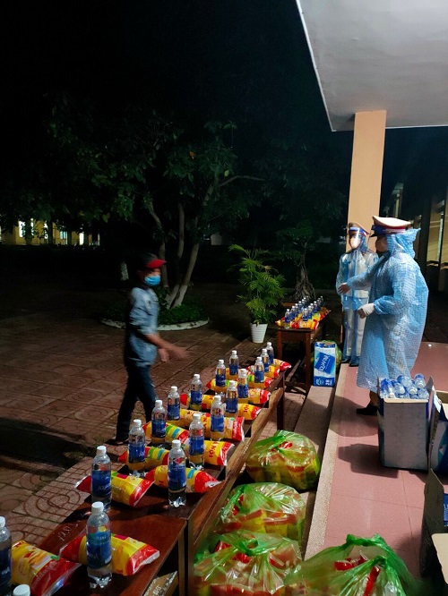 Phòng Cảnh sát giao thông hỗ trợ nước và bánh mì cho người dân về từ Đồng Nai đêm 29/7