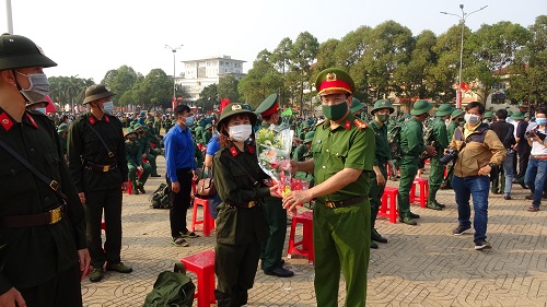Đồng chí Đại tá Phạm Tiến Triệu, Phó Giám đốc Công an tỉnh Đắk Lắk tặng hoa và động viên Trần Thị Thu Trang nữ tân binh duy nhất tham gia nghĩa vụ Công an nhân dân