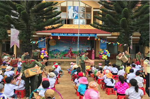 Trong chương trình vui Tết Trung thu, Đoàn công tác đã phối hợp với Ban Giám hiệu nhà trường tổ chức tổ chức hoạt động múa Lân, các trò chơi tập thể, liên hoan văn nghệ; đồng thời, tặng 01 phần quà cho Trường học trị giá 300.000 đồng, 170 đôi dép Sandal cho các em học sinh khối lớp 4, lớp 5 trị giá 8.500.000 đồng, tặng 15 phần quà trị giá 3.000.000 đồng cho các học sinh giỏi có hoàn cảnh khó khăn và 550 xuất bánh, kẹo, đèn lồng cho các em học sinh trị giá trên 4.000.000 đồng.