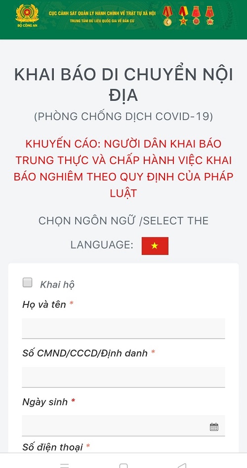 Trang sức khỏe khai báo di chuyển nội địa