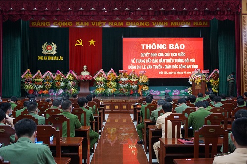 Chiều 5/2/2021, Công an tỉnh Đắk Lắk tổ chức thông báo Quyết định của Chủ tịch nước về thăng cấp hàm Thiếu tướng đối với đồng chí Lê Văn Tuyến - Giám đốc Công an tỉnh. Đồng chí Phạm Minh Tấn – Phó bí thư Thường trực Tỉnh ủy; đồng chí Y Giang Gry Niê Knơng - Phó chủ tịch UBND tỉnh Đắk Lắk cùng đại diện lãnh đạo một số đơn vị của Bộ Công an đóng quân trên địa bàn tỉnh và một số sở, ban, ngành của tỉnh đã đến dự.