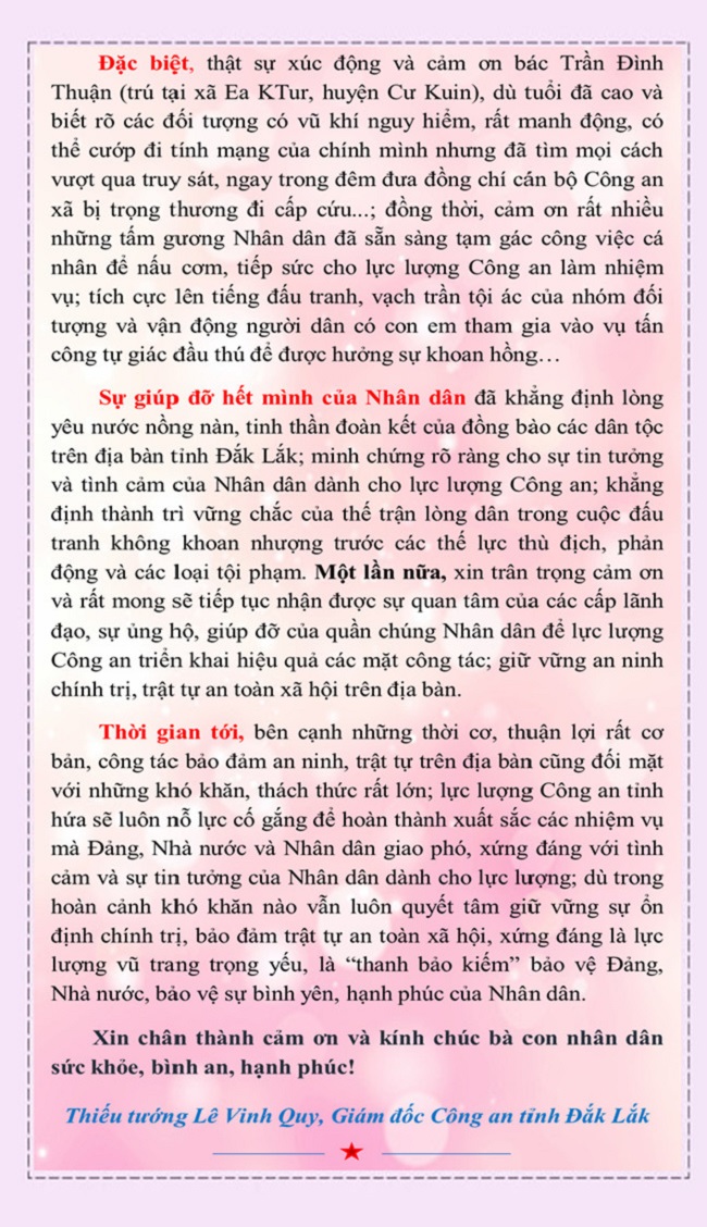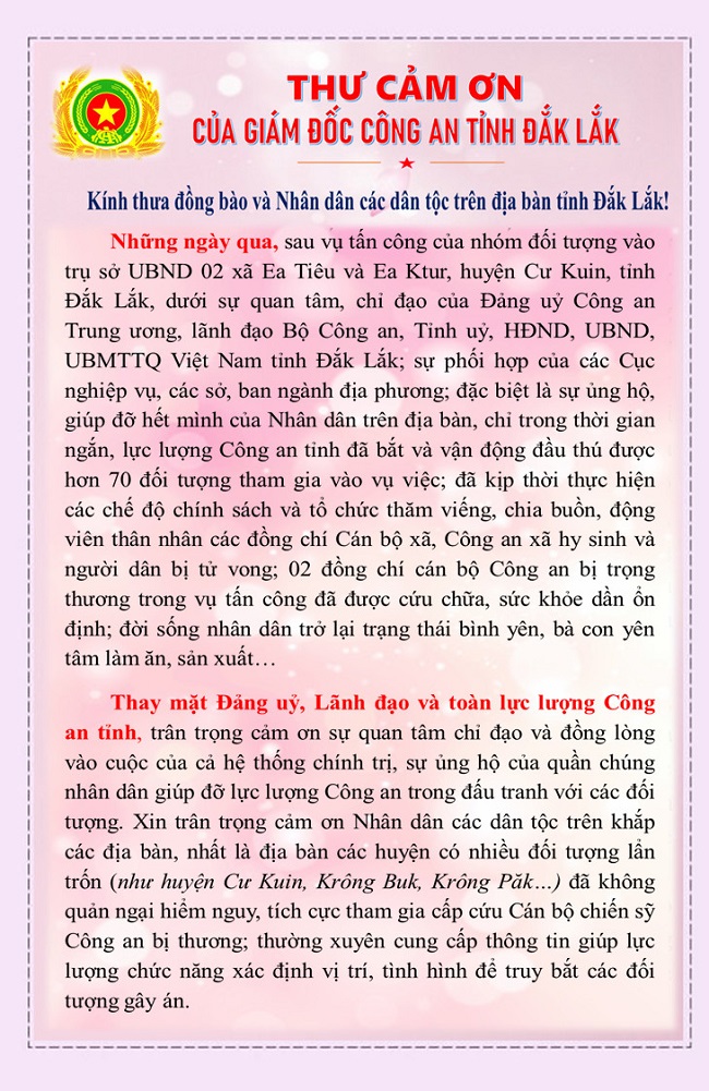 Thay mặt Đảng uỷ, Lãnh đạo và toàn lực lượng Công an tỉnh, trân trọng cảm ơn sự quan tâm chỉ đạo và đồng lòng vào cuộc của cả hệ thống chính trị, sự ủng hộ của quần chúng nhân dân giúp đỡ lực lượng Công an trong đấu tranh với các đối tượng. Xin trân trọng cảm ơn Nhân dân các dân tộc trên khắp các địa bàn, nhất là địa bàn các huyện có nhiều đối tượng lẩn trốn (như huyện Cư Kuin, Krông BÚk, Krông Pắc…) đã không quản ngại hiểm nguy, tích cực tham gia cấp cứu Cán bộ chiến sỹ Công an bị thương; thường xuyên cung cấp thông tin giúp lực lượng chức năng xác định vị trí, tình hình để truy bắt các đối tượng gây án.