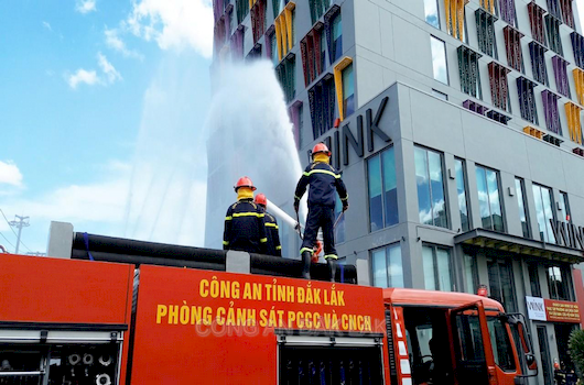 Vừa qua, Phòng Cảnh sát PCCC và CNCH, Công an tỉnh Đắk Lắk phối hợp với Công ty TNHH thương mại đầu tư Vĩnh Bảo tổ chức thực tập phương án chữa cháy, cứu nạn, cứu hộ tại khách sạn Wink Tuy Hòa; địa chỉ: 01 Điện Biên Phủ, phường Tuy Hòa, tỉnh Đắk Lắk.