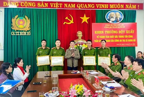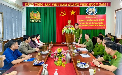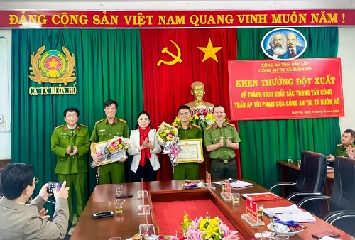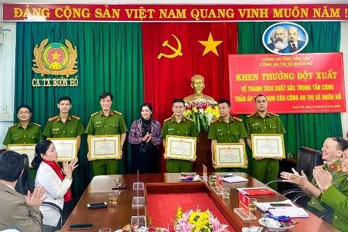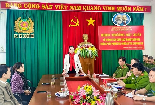 Sáng ngày 14/12/2022, đồng chí Nguyễn Thị Thu Nguyệt, Tỉnh ủy viên, Bí thư Thị ủy; đồng chí H’Blă Mlô, Phó Bí thư, Thường trực Thị ủy, Chủ tịch Hội đồng nhân dân thị xã; đồng chí Đặng Gia Duẩn, Phó Bí thư Thị ủy đã đến thăm, ghi nhận và khen thưởng đột xuất cho Công an thị xã Buôn Hồ đã có thành tích xuất sắc trong đấu tranh với tội phạm đánh bạc và tổ chức đánh bạc.