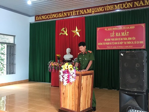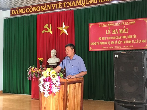 Sáng ngày 13/11/2019, Uỷ ban nhân dân xã Ea Ning đã tổ chức Lễ ra mắt mô hình điểm “Khu dân cư an toàn, bình yên không tội phạm và tệ nạn xã hội” tại thôn 24, xã Ea Ning. Tham dự buổi Lễ, có đồng chí Thượng tá Lê Trọng Liệu – Phó Trưởng Công an huyện Cư Kuin; đồng chí Trịnh Hoàng Sơn - Chủ tịch UBND xã Ea Ning, Trưởng ban chỉ đạo mô hình điểm cùng sự có mặt của công chức Đảng uỷ, HĐND, UBND, UBMTTQ xã Ea Ning; Ban Công an xã; Tổ tự quản về ANTT và đoàn thể thôn 24 xã Ea Ning.