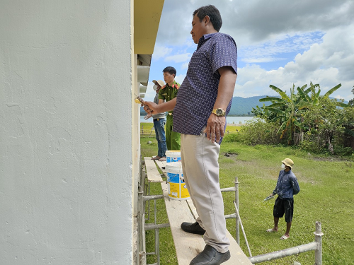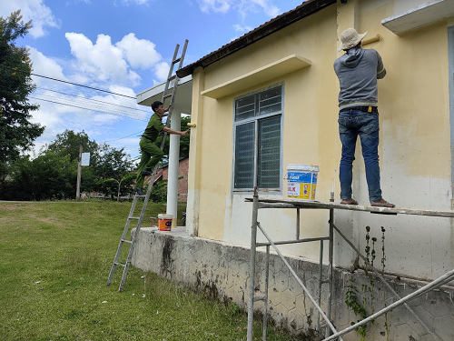 Công an xã Yang Tao phối hợp với Nhân dân Buôn Drung sơn, sửa lại Nhà Văn hóa cộng đồng