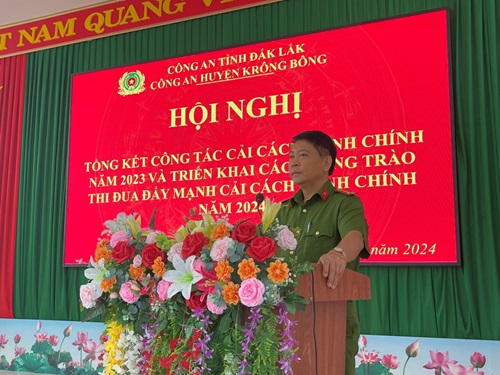 Nhằm đánh giá thực chất, khách quan, toàn diện về công tác cải cách hành chính (CCHC), tạo chuyển biến mạnh mẽ về nhận thức và hành động, nâng cao hiệu quả chỉ đạo, điều hành của chỉ huy các đội nghiệp vụ, Công an xã, thị trấn trong công tác CCHC, sáng ngày 24/01/2024, Công an huyện Krông Bông long trọng tổ chức Hội nghị Tổng kết công tác cải cách hành chính năm 2023 và triển khai các phong trào thi đua đẩy mạnh cải cách hành chính năm 2024.