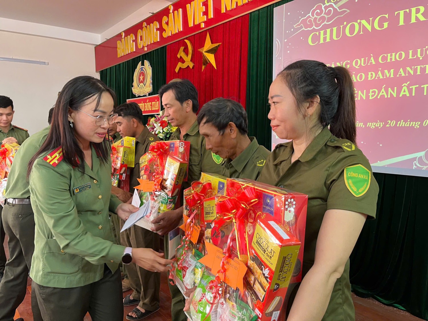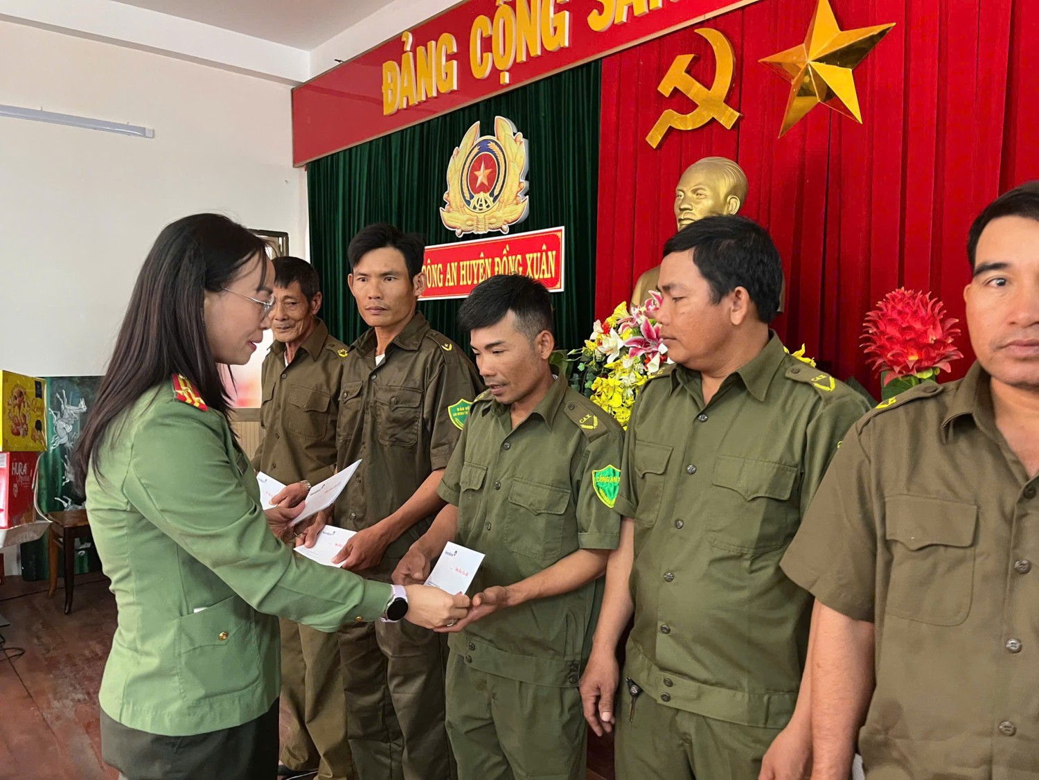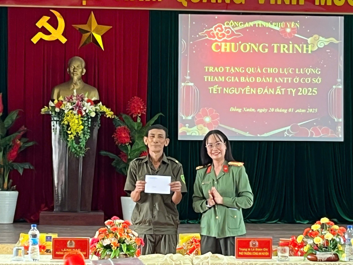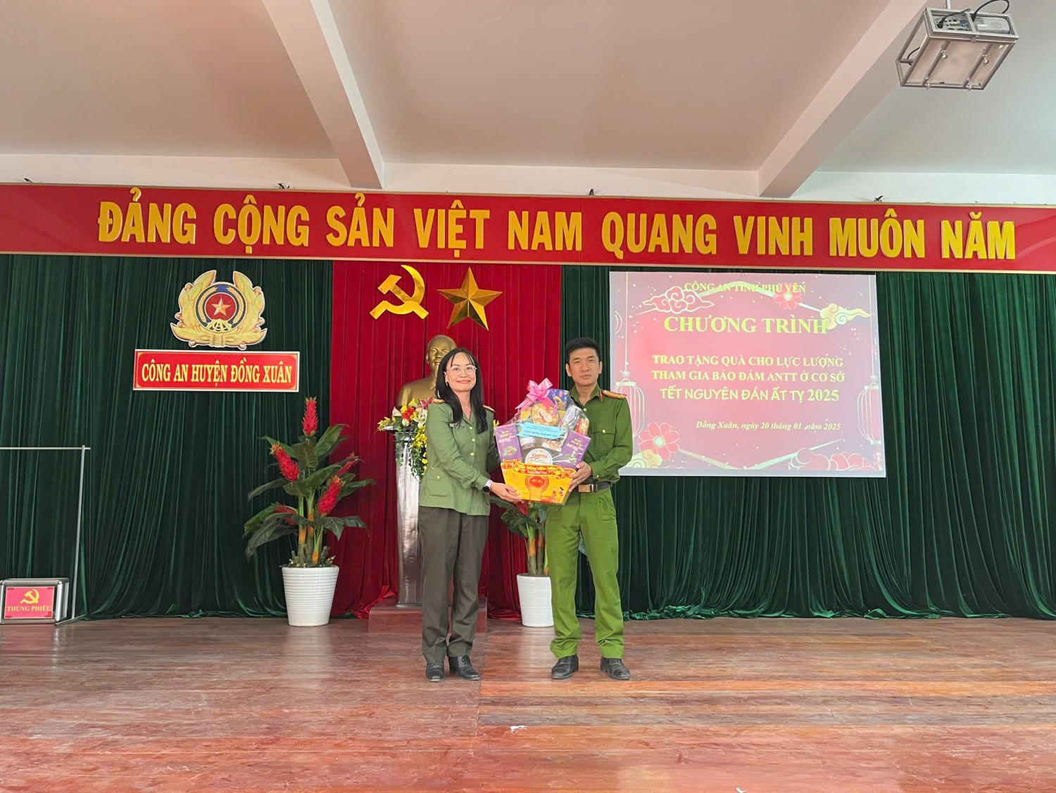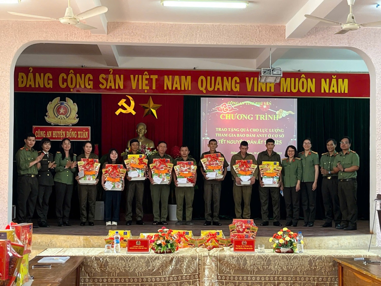 Sáng ngày 20/01/2025, được sự ủy thác của lãnh đạo Công an tỉnh, Chi đoàn, Hội Phụ nữ Phòng Tham mưu cùng với sự đồng hành, hỗ trợ của Ngân hàng Thương mại Cổ phần Công thương Việt Nam chi nhánh tỉnh Phú Yên (Vietinbank) tổ chức chương trình tặng 50 suất quà Tết (mỗi suất 500 nghìn đồng) cho lực lượng tham gia bảo vệ an ninh trật tự ở cơ sở tại huyện Đồng Xuân. Qua chương trình, cho thấy lãnh đạo Công an tỉnh cùng các cấp, các ngành đã dành nhiều sự quan tâm sâu sắc đối với những nỗ lực và đóng góp quan trọng của lực lượng tham gia bảo vệ an ninh trật tự ở cơ sở. Lực lượng tham gia bảo vệ an ninh trật tự ở cơ sở chính là cánh tay nối dài của lực lượng Công an nhân dân và phối hợp, hỗ trợ đắc lực trong việc giữ vững an ninh chính trị, bảo đảm trật tự an toàn xã hội và góp phần thúc đẩy sự phát triển kinh tế - xã hội trên địa bàn tỉnh. Đông thời, đây cũng là hoạt động an sinh xã hội nhằm tạo khí thế thi đua sôi nổi trong dịp thi đua lập thành tích chào mừng kỷ niệm 95 năm Ngày thành lập Đảng Cộng sản Việt Nam (03/02/1930-03/02/2025); Mừng Đảng, mừng Xuân Ất Ty 2025.