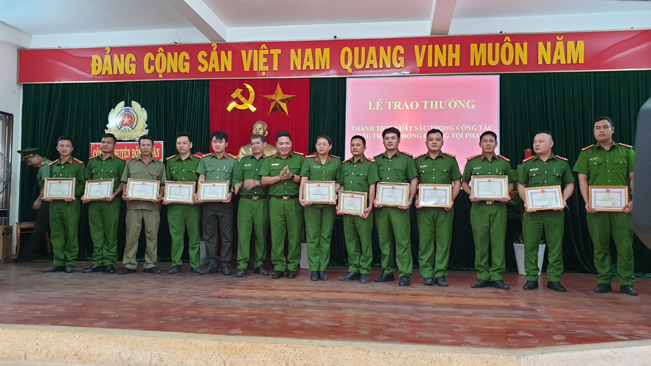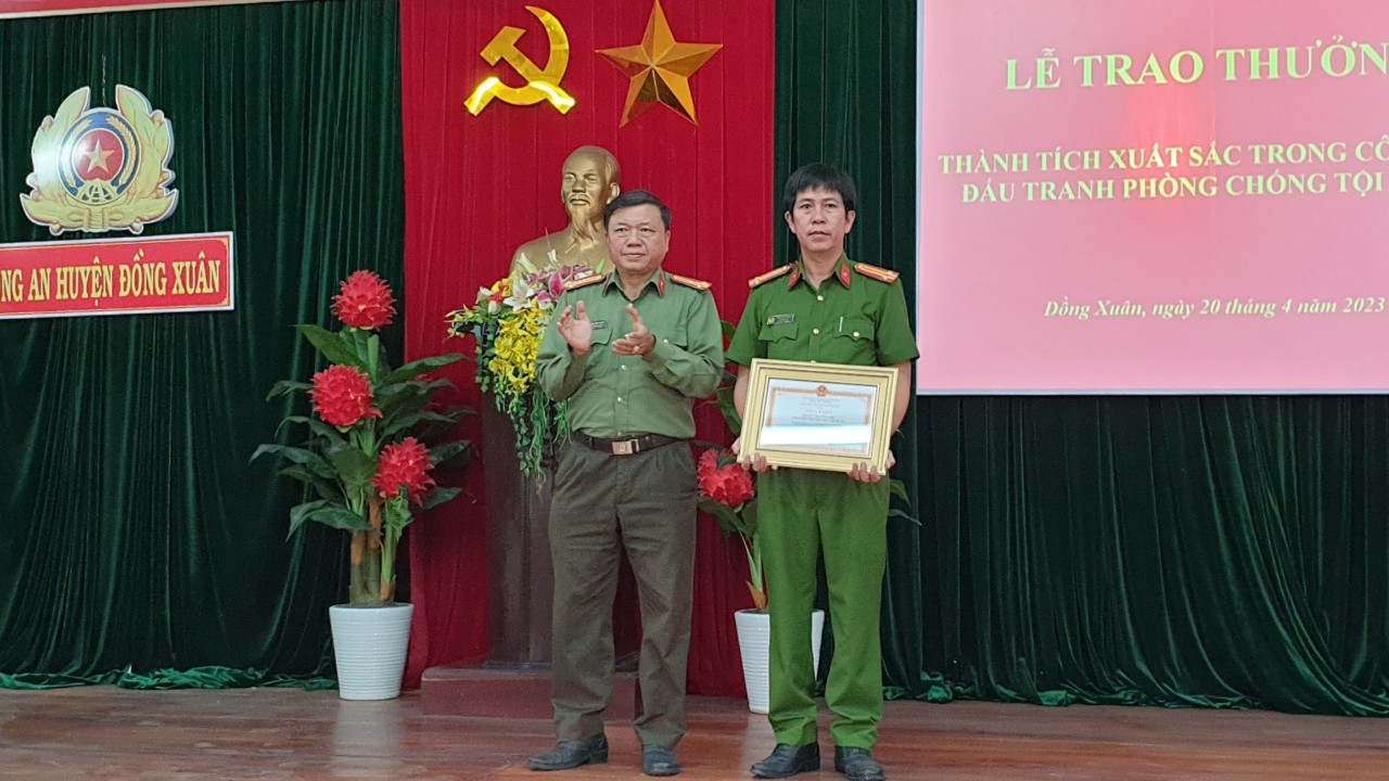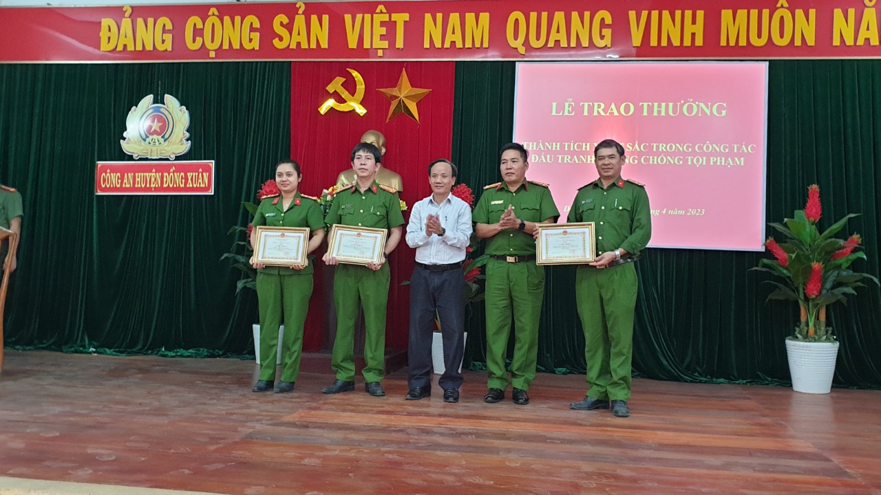 Từ tháng 3 đến nay, Công an huyện Đồng Xuân đã nhanh chóng điều tra, làm rõ các vụ trộm cắp tài sản, đánh bạc và tổ chức sử dụng trái phép chất ma tuý trên địa bàn; khởi tố hơn 13 đối tượng, thu giữ hơn 106 triệu đồng cùng nhiều tang vật liên quan. Với thành tích xuất sắc trên, Giám đốc Công an tỉnh đã tặng giấy khen cho Đội Điều tra tổng hợp và 3 cá nhân; UBND huyện, UBND thị trấn La Hai đã trao giấy khen cho tập thể Công an huyện, Công an thị trấn La Hai và 14 cá nhân.