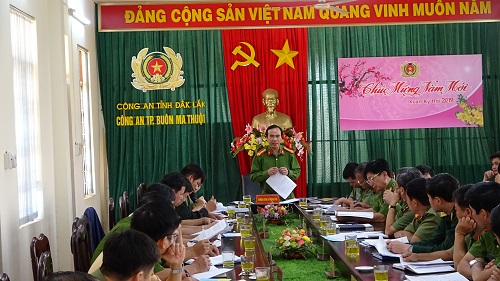Chiều ngày 31/01/2019, tại trụ sở Công an thành phố Buôn Ma Thuột, Công an thành phố phối hợp với các phòng nghiệp vụ thuộc Công an tỉnh; Ban Chỉ huy Quân sự thành phố, Phòng Quản lý đô thị thành phố và UBND Phường Tự An, Tân lợi, Thắng Lợi tổ chức triển khai Kế hoạch hiệp đồng tổ chức bắn pháo hoa trong dịp tết Nguyên đán Kỷ Hợi năm 2019.