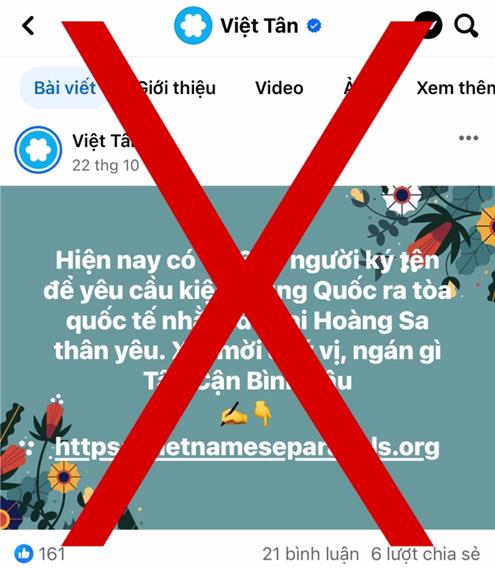 Lợi dụng tình hình Trung Quốc liên tiếp có các hoạt động xâm phạm chủ quyền biển đảo của Việt Nam trong thời gian gần đây, tổ chức khủng bố “Việt Tân” lại rục rịch sử dụng lại chiêu bài cũ của mình đó chính là kêu gọi ký “thỉnh nguyện thư” chuẩn bị cho sự kiện “50 năm Hoàng Sa”. Cụ thể, mới đây, những chú “Vịt vàng ba sọc” đã đăng tải các bài viết với lời lẽ như: “Hãy cùng chúng tôi chung tay lên tiếng bảo vệ chủ quyền lãnh thổ. Đó là bổn phận, trách nhiệm của mỗi người dân Việt Nam. Lòng tự tôn dân tộc không thể bị chà đạp…” và dẫn dắt người đọc đến trang web https://vietnameseparacels.org để kêu gọi chữ ký nhằm khởi phát việc trình lên Liên hợp quốc, vận động các tổ chức quốc tế, chính phủ các nước can thiệp vào vấn đề dân chủ, nhân quyền ở Việt Nam, gây áp lực lên Chính phủ Việt Nam phải có những hành động cụ thể để khẳng định chủ quyền của Việt Nam đối với quần đảo Hoàng Sa và Trường Sa. Nghe những anh “đu càng” nói về lòng tự tôn dân tộc và sự yêu nước mà thấy nực cười làm sao. Thực chất, chúng chỉ đang lợi dụng vấn đề biển đảo – một chủ để dễ chạm đến con tim của mỗi người dân Việt Nam yêu Tổ quốc để tạo cớ can thiệp vào công việc nội bộ của nước ta.