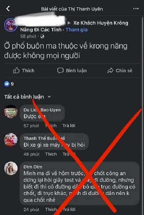 Cụ thể, một tài khoản Facebook đăng bài lên hỏi cộng đồng mạng: “Ở phố Buôn Ma Thuột về Krông Năng được không mọi người”? Ngay sau đó, có một số người vào bình luận, hướng dẫn đi về huyện Krông Năng bằng cách: “ Đi xe gì, xe máy hay bị hỏi”, trong đó có 1 tài khoản tên Dtm Dtm viết: “Mình mới đi về hôm trước, có chốt Công an dừng lại hỏi giấy test và giấy đi đường, nhưng biết đi thì có đường dân bỏ qua trục đường có chốt, đi trục khác, mình đi đường dân nên không có chốt nhé”.