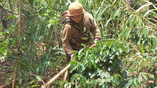 Chị H’Pruch Mlô đang chăm sóc vườn cây cà phê của gia đình