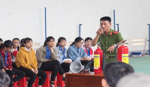 Các em học sinh các khối của trường THPT Nguyễn Thái Bình tập trung đông đủ để được hướng dẫn về phòng cháy, chữa cháy