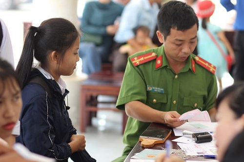 Cán bộ, chiến sĩ Công an huyện Ea Kar làm thủ tục cấp Chứng minh nhân dân cho các em học sinh