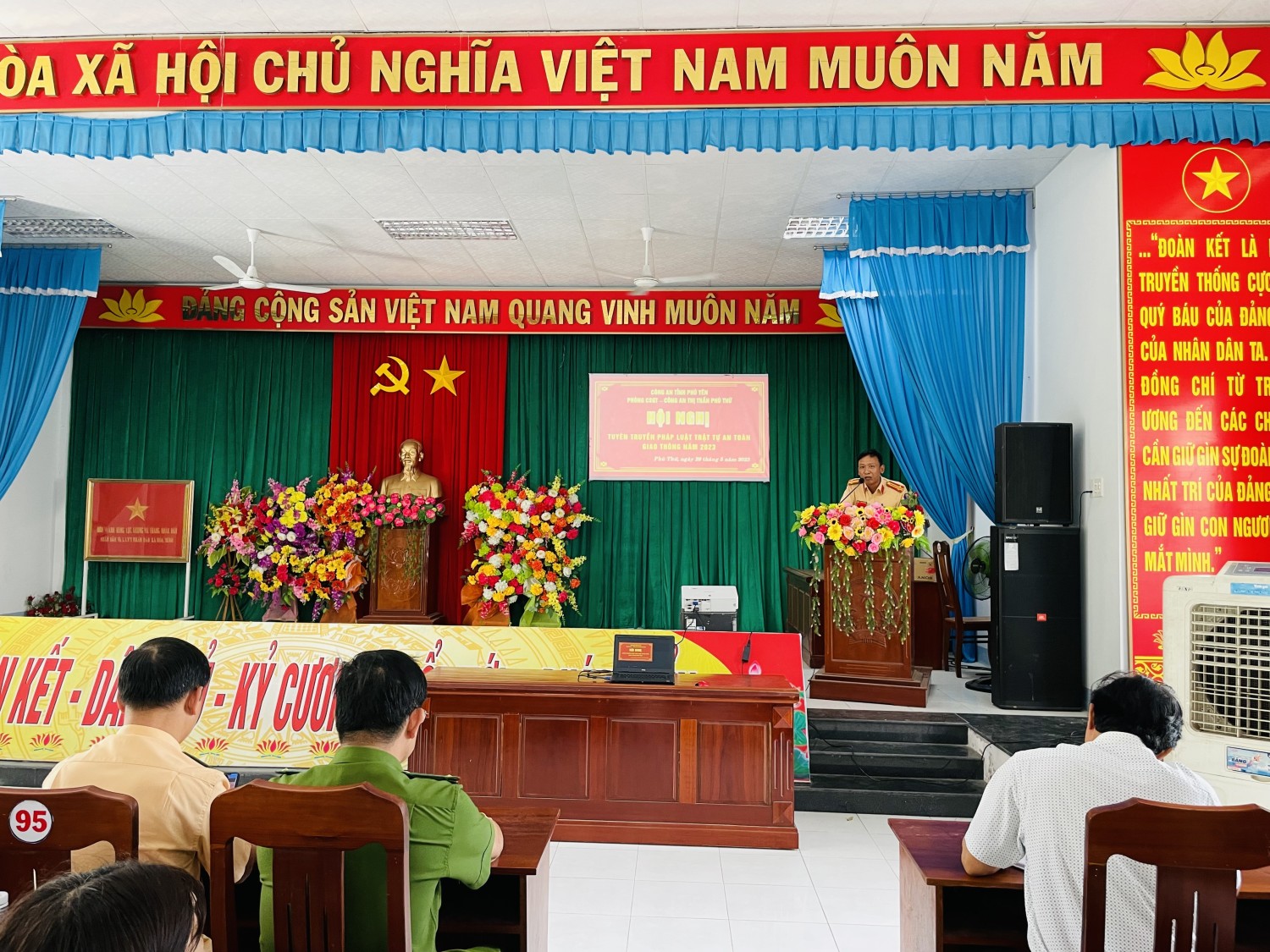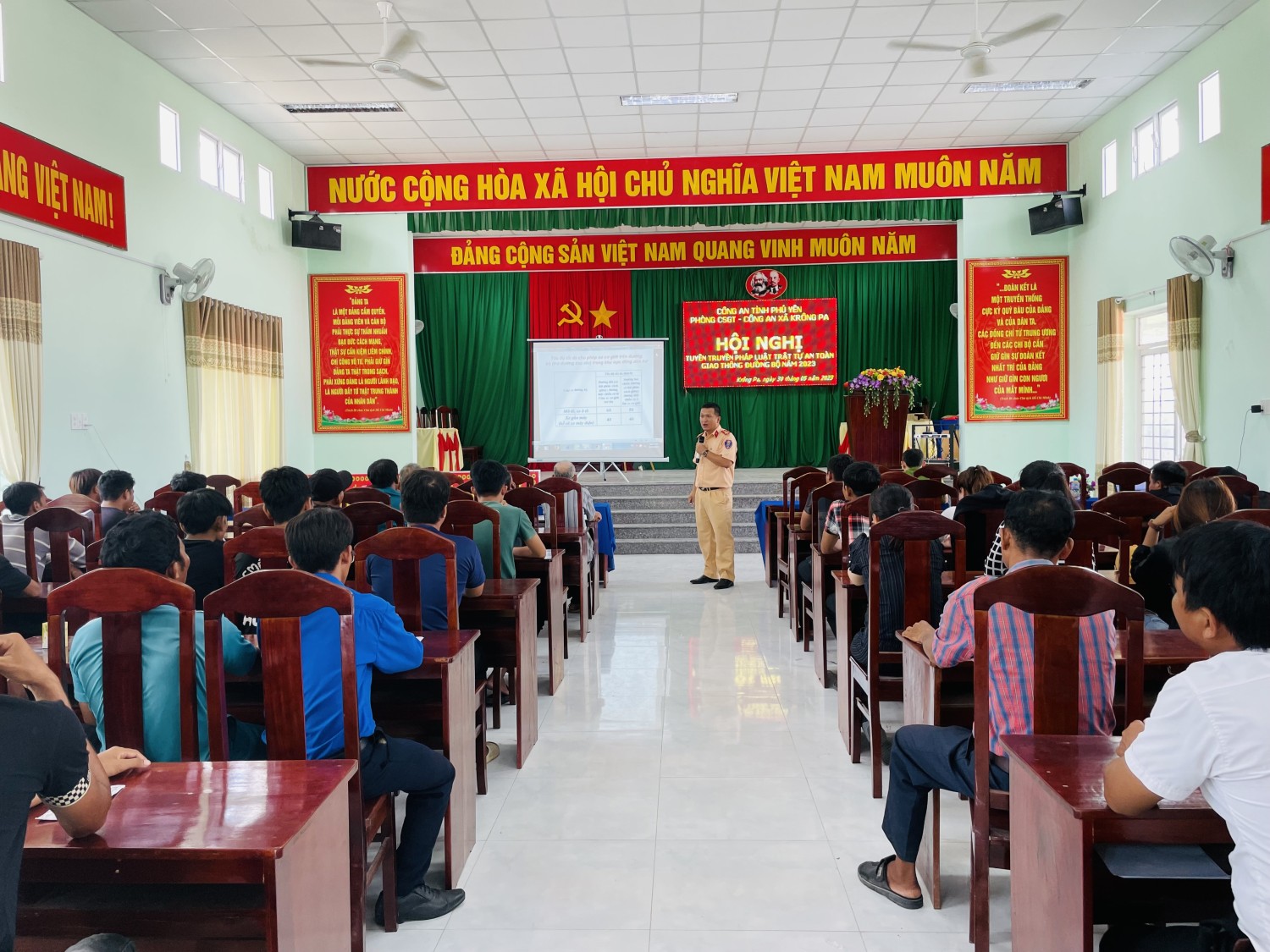 Phòng Cảnh sát giao thông, Công an tỉnh phối hợp Công an một số xã, phường, thị trấn trong tỉnh tổ chức chương trình tuyên truyền pháp luật về trật tự an toàn giao thông cho cán bộ, công nhân viên, người lao động, thanh niên trên địa bàn.