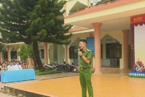 Báo cáo viên của Công an thành phố Buôn Ma Thuột tuyên truyền phổ biến giáo dục pháp luật cho học sinh