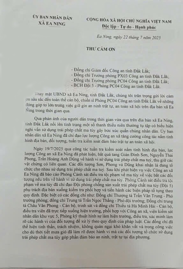 Trong Thư cảm ơn, UBND xã Ea Ning viết: “Các đồng chí đã thể hiện tinh thần, trách nhiệm, không quản ngại khó khăn vất vả trong công việc cho dù thời tiết mưa gió đã làm rõ được hành vi mà các đối tượng tổ chức sử dụng trái phép chất ma túy góp phần đảm bảo an ninh, trật tự tại địa phương.