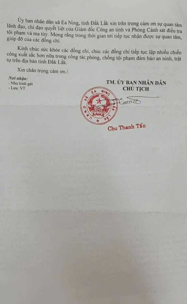 Ủy ban nhân dân xã Ea Ning, tỉnh Đắk Lắk xin trân trọng cảm ơn sự quan tâm lãnh đạo, chỉ đạo quyết liệt của Giám đốc Công an tỉnh và Phòng Cảnh sát điều tra tội phạm và ma túy. Mong rằng trong thời gian tới tiếp tục nhận được sự quan tâm, giúp đỡ của các đồng chí”.