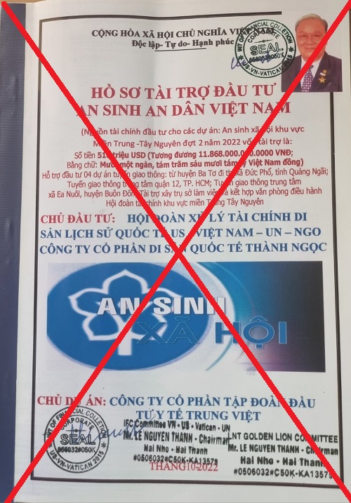 Các đối tượng sử dụng giấy giới thiệu của “Công ty cổ phần tập đoàn đầu tư y tế Trung Việt” đến liên hệ làm việc với nhiều địa phương đề nghị tiếp nhận nguồn tài trợ của “Hội đoàn xử lý Tài chính Di sản Lịch sử Quốc tế US - Việt Nam - UN - NGO” với số tiền tiếp nhận lên đến hàng trăm triệu đô la Mỹ. “Hội đoàn xử lý Tài chính Di sản Lịch sử Quốc tế US - Việt Nam - UN - NGO” do Lê Nguyên Thành thành lập, là tổ chức có dấu hiệu lừa đảo, được Bộ Công an cảnh báo trên báo CAND điện tử và nhiều tờ báo chính thống khác. Thời gian qua, Lê Nguyên Thành và các đối tượng đã sử dụng nhiều pháp nhân là các công ty: “Công ty Cổ phần Di sản quốc tế Thành Ngọc”, “Công ty CP quốc tế Hồ Tràm”, “Công ty CP Di sản quốc tế Hồ Tràm”, “Công ty cổ phần tập đoàn đầu tư y tế Trung Việt” để lập nhiều bộ “hồ sơ”, “tờ trình” liên hệ nhiều địa phương trên cả nước đề nghị tiếp nhận nguồn vốn của “Hội đoàn xử lý Tài chính Di sản Lịch sử Quốc tế US - Việt Nam - UN - NGO”. Đáng chú ý, Lê Nguyên Thành còn sử dụng trang Facebook “Đặc khu kinh tế - biển đảo Hoàng Sa - Trường Sa” đăng tải các thông tin không có thật là các “tờ trình”, “đơn đề nghị” liên quan đến “Hội đoàn xử lý di sản tài chính quốc tế”, có thể gây hiểu nhầm và ảnh hưởng đến uy tín của Việt Nam.