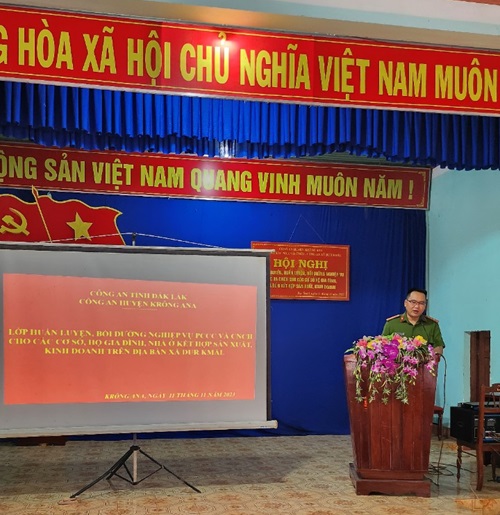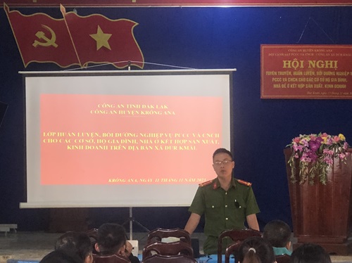 Báo cáo viên thuộc Đội Cảnh sát PCCC&CNCH Công an huyện Krông Ana tuyên truyền, hướng dẫn tại lớp tập huấn