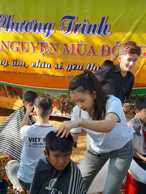 Tình nguyện viên cắt tóc cho các em học sinh