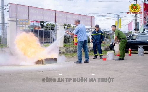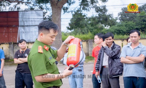 Trong phần thực hành, học viên tham gia lớp tuập huấn đã được cán bộ phòng Cảnh sát PCCC và CNCH hướng dẫn sử dụng bình chữa cháy dập tắt khay xăng, bình gas; cách thoát nạn trong đám cháy, cách sử dụng một số phương tiện chữa cháy thông dụng…